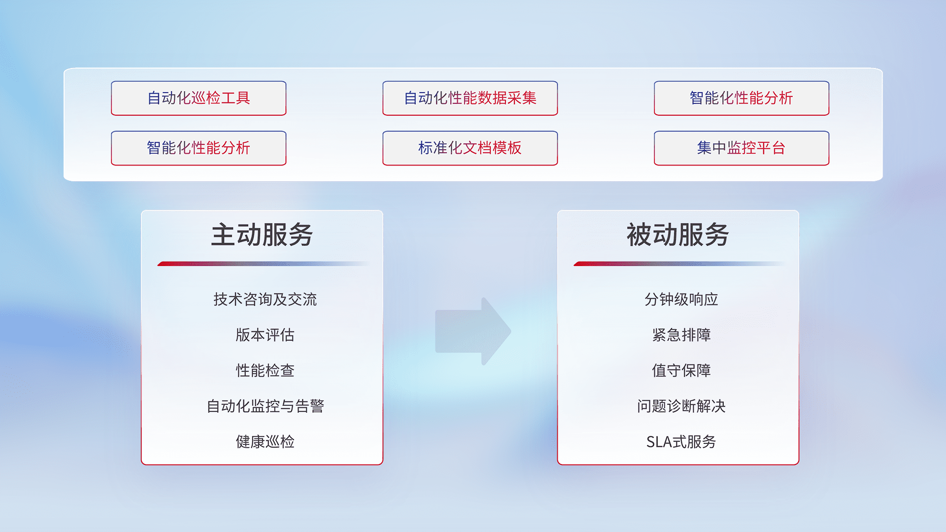 智能化工具和标准化文档,,,,保障服务质量,,,,提供主动服务(包含技术咨询、、、、版本评估、、、性能检查、、、自动化监控与告警、、健康巡检)和被动服务包含(分钟级响应、、、紧急排障、、、、值守保障、、问题诊断解决、、、SLA服务)。。。。