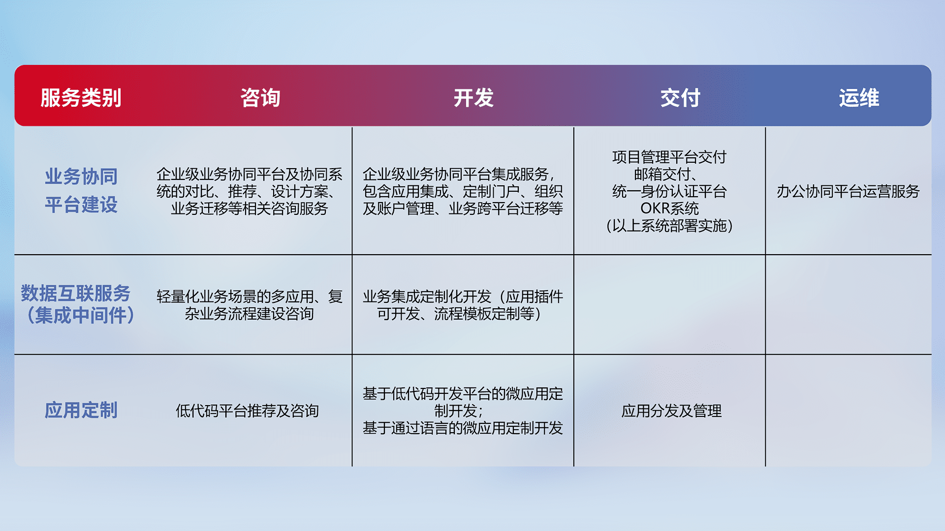针对钉钉、、企微、、、IDaas等平台级产品提供产品的规划、、、方案、、、交付、、定制化开发等服务,,,,实现如统一协同办公、、、智能客户服务、、、、混合会议管理、、、智能数据查询、、、、等业务场景,,,实现数字化转型。。。